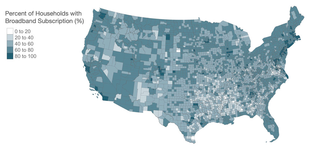Access to broadband internet is associated with a myriad of economic benefits including local growth, lower unemployment, increased household income levels, business activity, and general entrepreneurial activity. High-speed internet may also have social and health benefits, including easier access to social supports and telehealth resources. The transition of schools across the country to remote learning during the COVID-19 pandemic highlighted the critical importance of this digital resource to education.